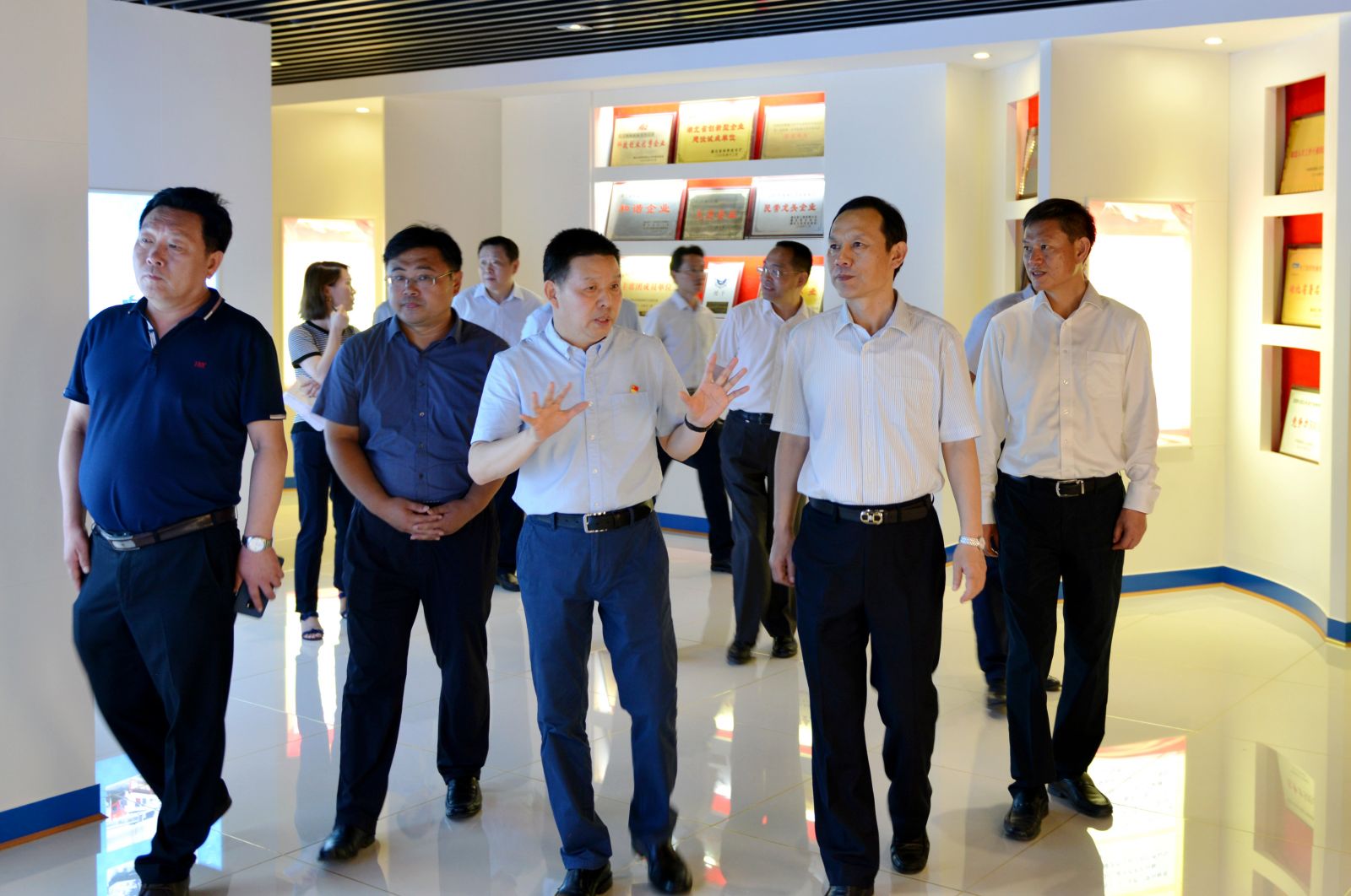 湖北省委副書記、武漢市委書記馬國強(前中)、天門市委書記莊光明(前右)聽取天門紡機董事長沈方勇(前左)匯報產(chǎn)品研發(fā)情況