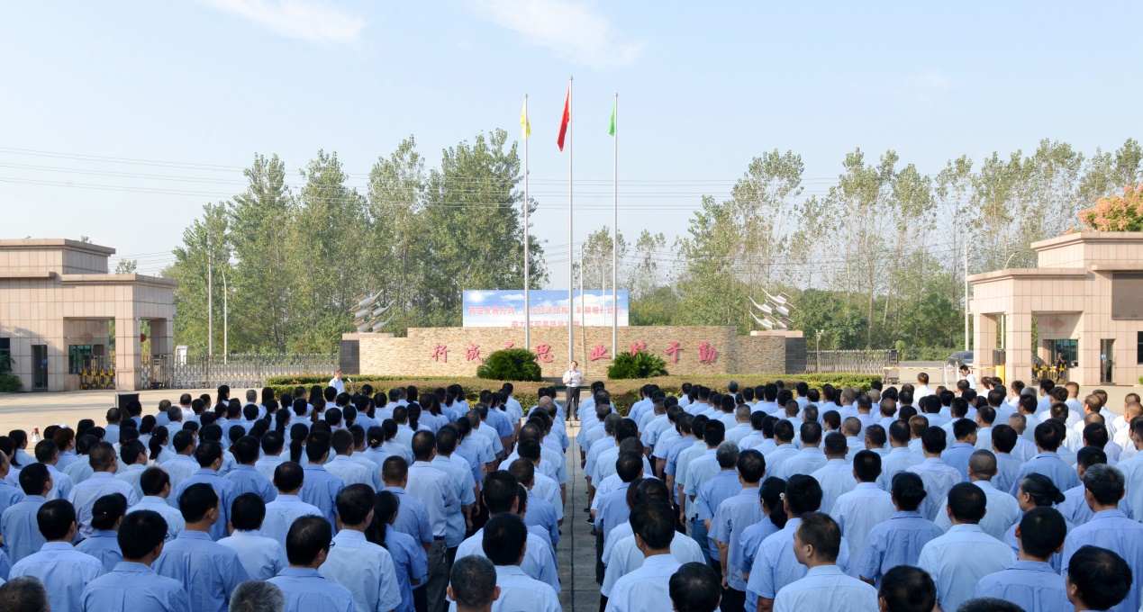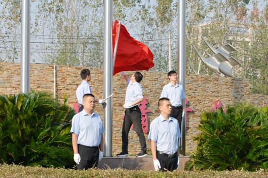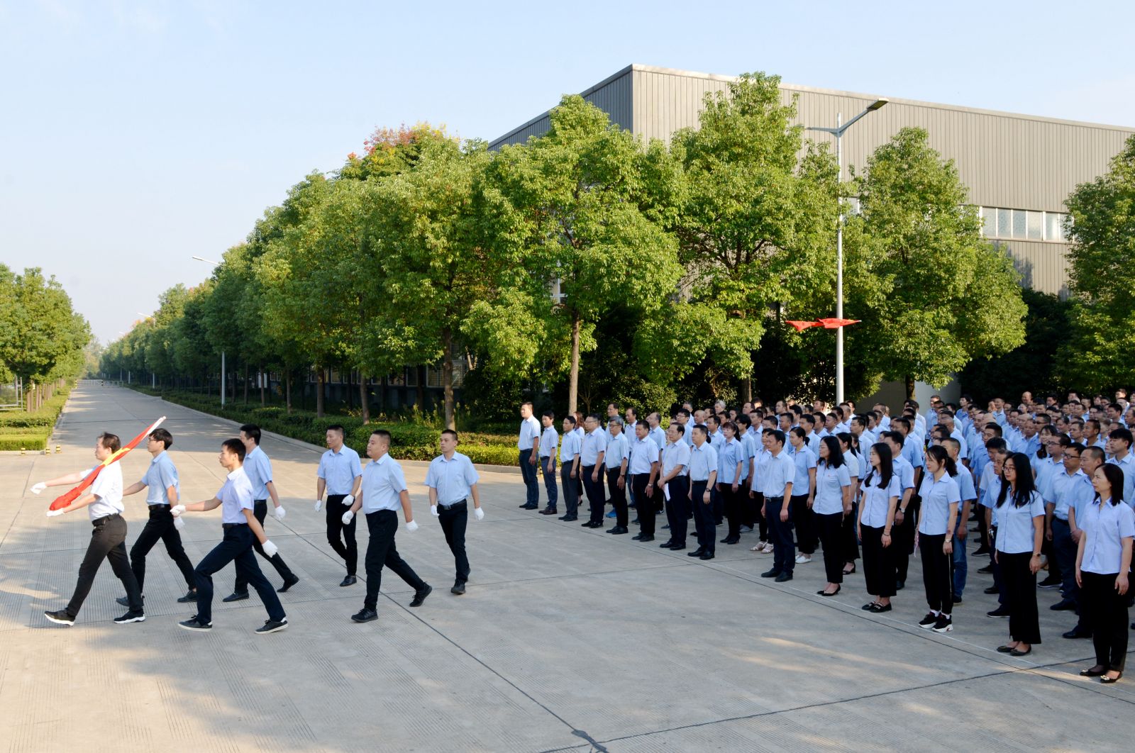8:20時,活動儀式在總經(jīng)理焦倫進的主持下啟動,七名旗手邁正步從員工方隊繞過,直達旗壇,行進口令威武響亮。在主持人的指令下,三名旗手將一面鮮艷的五星紅旗在莊嚴(yán)的國歌聲中徐緩地升上天空,員工方隊注目國旗,唱起雄壯的國歌。
