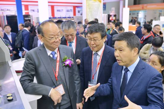 中國紡織工業(yè)聯(lián)合會黨委書記、秘書長高勇(左1)聽取董事長沈方勇介紹參展情況