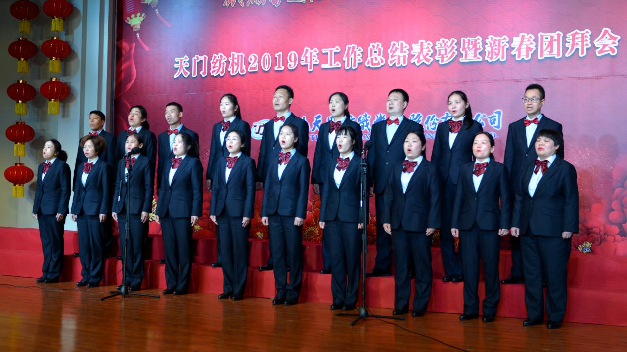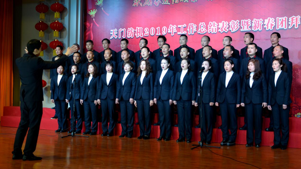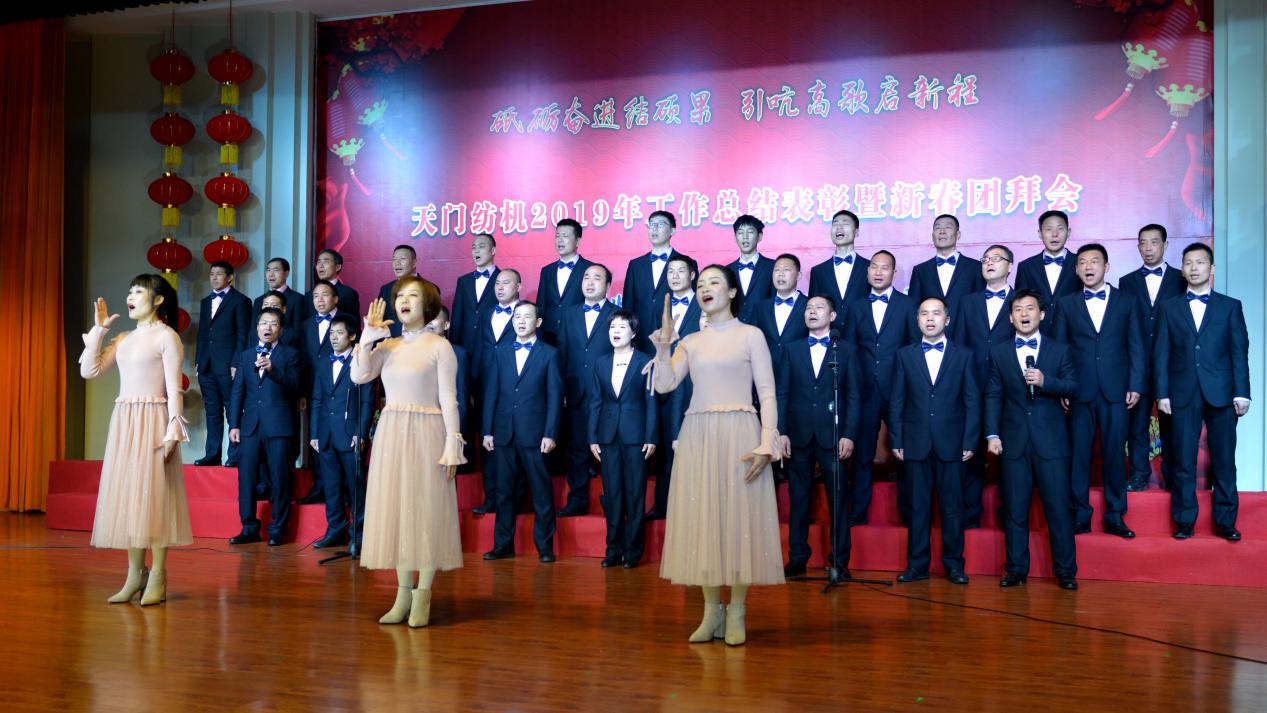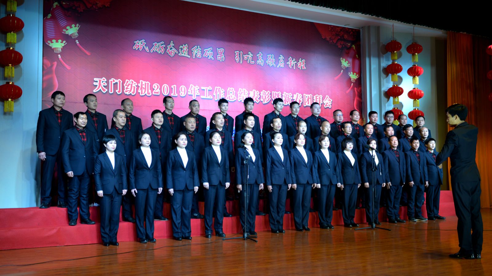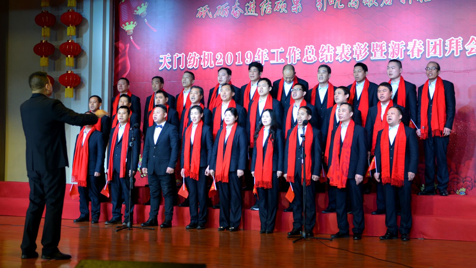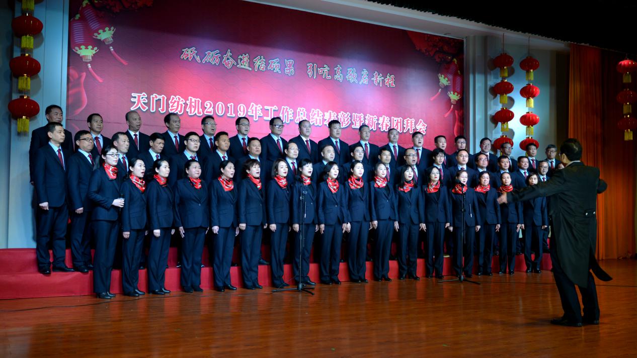 2020年1月21日下午,湖北天門紡織機(jī)械股份有限公司綜合樓多功能廳張燈結(jié)彩、暖流融融,一場主題為“砥礪奮進(jìn)結(jié)碩果、引吭高歌啟新程”的年度總結(jié)表彰暨新春團(tuán)拜會在這里舉行,400多名員工身著公司新佩發(fā)的西服套裝,精神奕奕地走進(jìn)會場。13:00整,三位主持人靚妝登場,宣布2019年度總結(jié)表彰暨新春團(tuán)拜會開始。