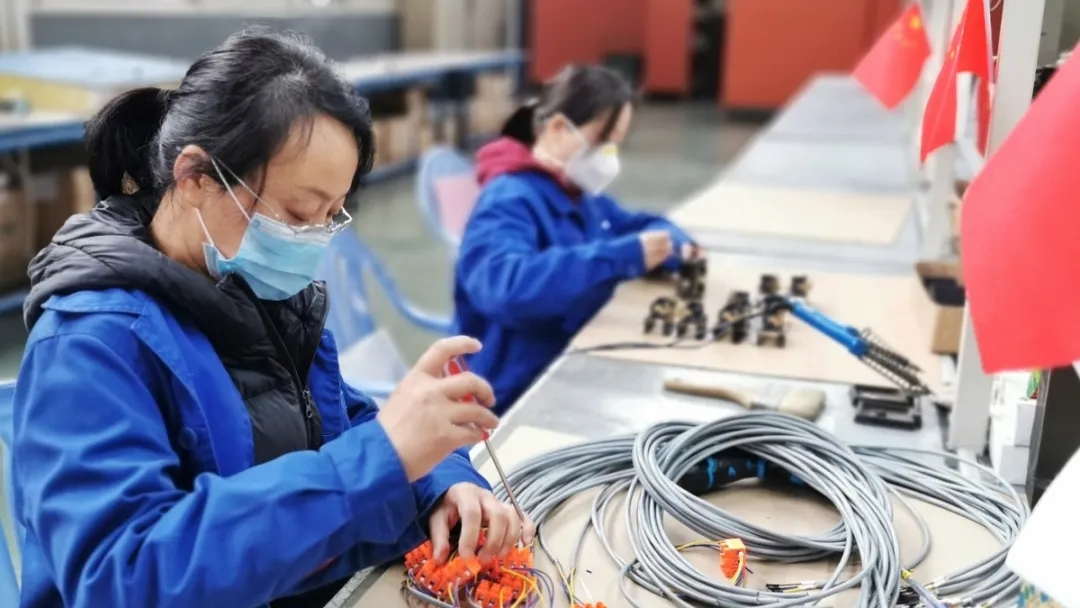 紡電員工李莉、徐艷華根據發(fā)貨型號機型進行電器零部件配套整理