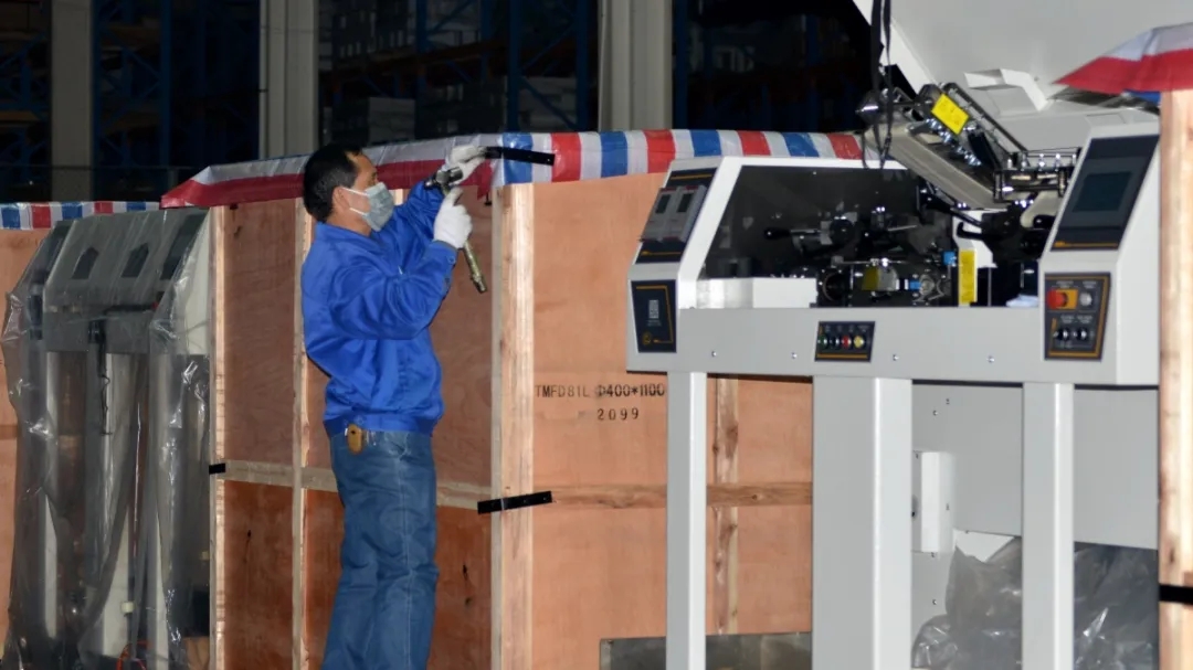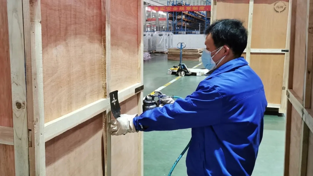 總裝車間主任彭文武對發(fā)貨產品包裝作邊角固定