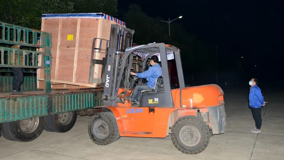 夜幕降臨,公司叉車司機姚順華抓緊時間將包裝好的產品進行裝車作業(yè)