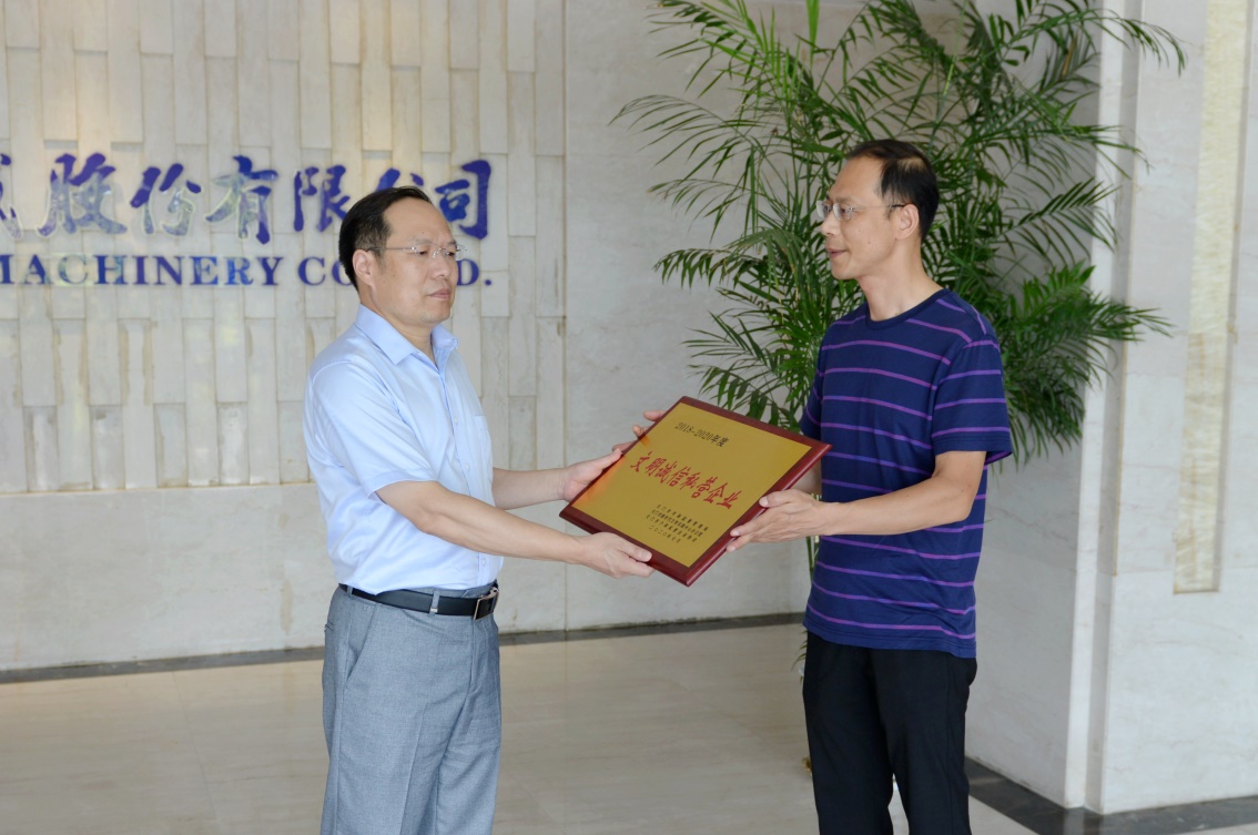 8月18日,天門市市場監(jiān)督管理局對天門紡機獲得的"文明誠信私營企業(yè) "榮譽進(jìn)行現(xiàn)場授牌,黨委書記魯?shù)挛拇砉窘优?。