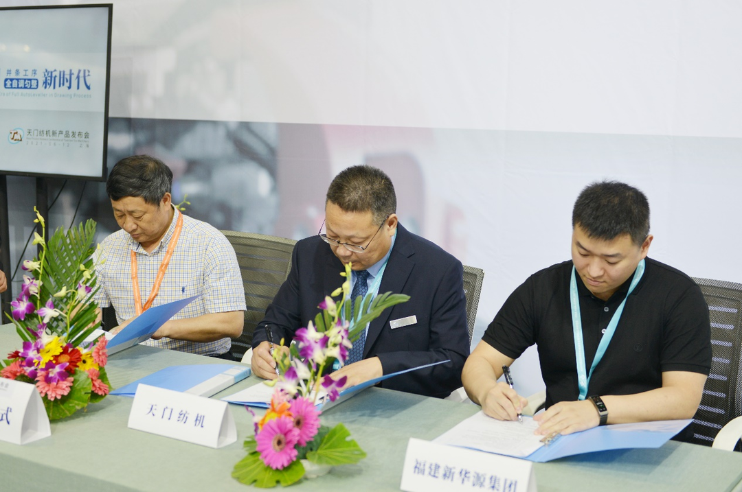 發(fā)布會上,TM15、TM19首批客戶福建新華源紡織集團有限公司、湖北妙虎紡織有限責任公司等紡企,與天門紡機現(xiàn)場簽訂戰(zhàn)略合作協(xié)議,將在“并條工序全自調勻整”深度合作、攜手共進。
