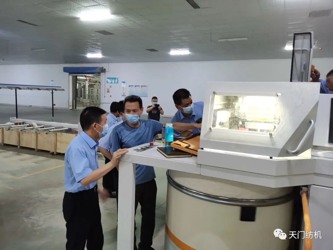天門(mén)紡機(jī)“全球首款超大卷裝雙眼高速自調(diào)勻整并條機(jī)”—TM19自6月份上海展會(huì)首次亮相后,已布點(diǎn)在不同客戶(hù)處并線試紡3月有余。為了解該機(jī)并線后的真實(shí)使用情況,9月18日,天門(mén)紡機(jī)董事長(zhǎng)沈方勇、總經(jīng)理焦倫進(jìn)帶領(lǐng)技術(shù)研發(fā)人員組成的TM19評(píng)估組,專(zhuān)程赴卓爾天龍紡織公司,現(xiàn)場(chǎng)考察實(shí)際使用情況,征求客戶(hù)意見(jiàn)建議。