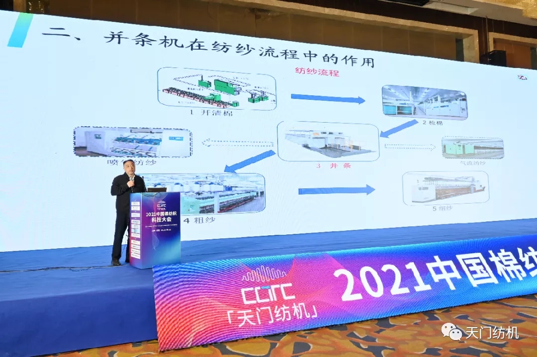 湖北天門紡織機(jī)械股份有限公司總經(jīng)理焦倫進(jìn)作了《并條機(jī)的創(chuàng)新與未來》的專題報(bào)告。在報(bào)告中,焦倫進(jìn)總經(jīng)理介紹了并條機(jī)在紡紗流程中的作用,并就目前紡織企業(yè)對并條機(jī)創(chuàng)新的要求,從傳動(dòng)結(jié)構(gòu)及精度、加壓系統(tǒng)、牽伸裝置、清潔系統(tǒng)、部件及提供設(shè)備的數(shù)字化、信息化、智能化水平等方面進(jìn)行介紹。最后,焦倫進(jìn)總經(jīng)理指出未來并條機(jī)將向著梳并聯(lián)合、并粗聯(lián)、短流程一體機(jī)在技術(shù)上的突破方向發(fā)展。