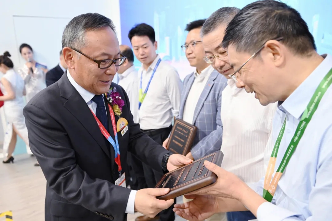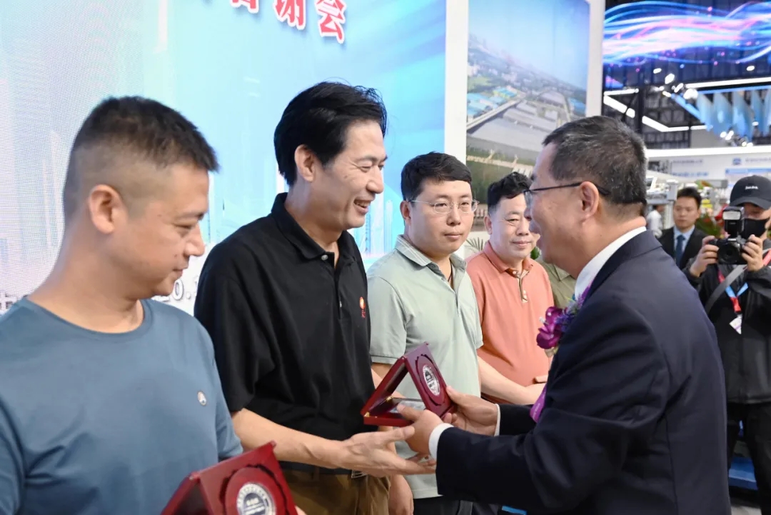 天門(mén)紡機(jī)副總經(jīng)理肖少華宣布為在并條新技術(shù)、新產(chǎn)品示范應(yīng)用上作出突出貢獻(xiàn)的華茂集團(tuán)、魏橋紡織、魯泰紡織等45家企業(yè)名單,中國(guó)棉紡織行業(yè)協(xié)會(huì)董奎勇會(huì)長(zhǎng)為這些企業(yè)代表頒發(fā)紀(jì)念牌。